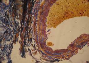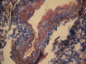 Fig 1: The morphology of the bronchial arteries of the lungs in the acute phase of III-IV stage of COPD: a – bronchial artery wall with symptoms of disorganization; б - bronchial artery wall hyperelastosis; в – changes in luminal surface of epithelial layer and distinct bellows of external elastic membrane; г –hyperplasia of media; д – fibrinoid necrosis of the bronchial artery walls; e – lamination, fragmentation and disorganization of the bronchial artery elastic membranes. Staining: а-в – after Mason; г-д – by MSB method in Zerbino-Lukasevych modification; e – with fuchsin after Hart. Zooming: а-в – ocular 10, lens 10; г-е – ocular 10, lens 20.